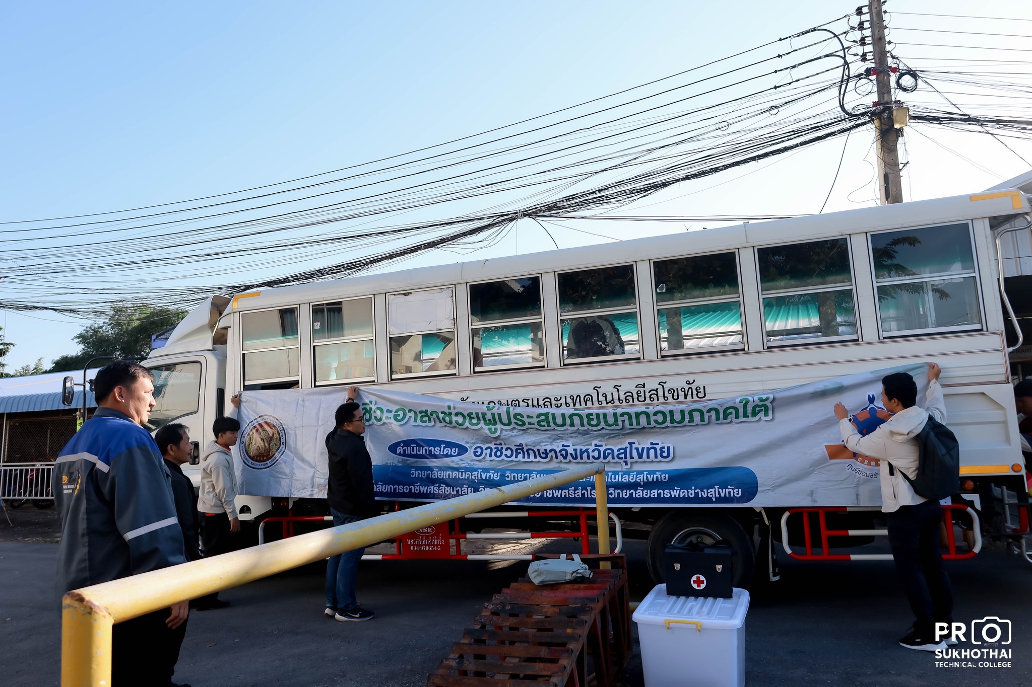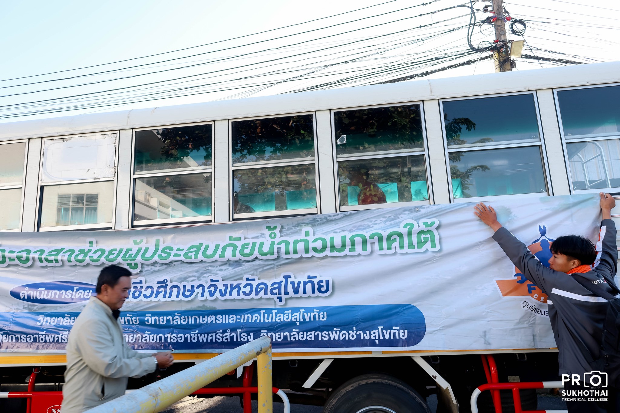 อาชีวศึกษาจังหวัดสุโขทัย อาชีวะอาสา ช่วยเหลือน้ำท่วมภาคใต้ (สุโขทัย-สงขลา) นายสมใจ รอดคง ผู้อำนวยการวิทยาลัยเทคนิคสุโขทัย ปฏิบัติหน้าที่ผู้อำนวยการสำนักงานอาชีวศึกษาจังหวัดสุโขทัย พร้อมผู้บริหารในสังกัด คณะครู ร่วมส่งและให้กำลังใจ ทีมงานโครงการพิเศษและบริการชุมชน นำทีมโดยนายอานนท์ จันทร์หอม รองผู้อำนวยการฯ ครู นักเรียน เข้าร่วมช่วยเหลือผู้ประสบอุทกภัยภัย