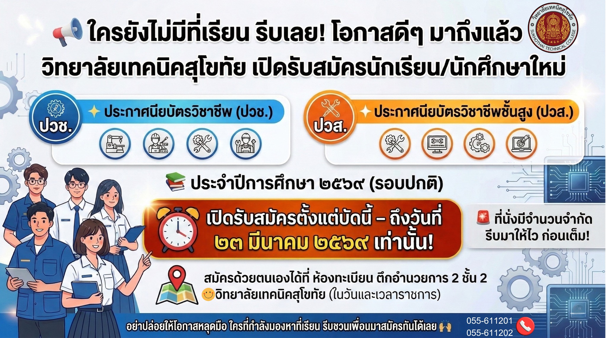 วิทยาลัยเทคนิคสุโขทัย เปิดรับสมัครนักเรียน/นักศึกษาใหม่ เข้าศึกษาต่อในระดับ ประกาศนียบัตรวิชาชีพ (ปวช.) ประกาศนียบัตรวิชาชีพชั้นสูง (ปวส.) ประจำปีการศึกษา ๒๕๖๙ (รอบปกติ)