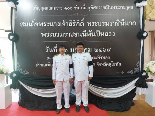 วิทยาลัยเทคนิคสุโขทัย โดยผู้อำนวยการสมใจ รอดคง มอบหมายให้ตัวแทนครู ร่วมพิธีบำเพ็ญกุศลสตมวาร ๑๐๐ วัน เพื่ออุทิศถวายเป็นพระราชกุศลสมเด็จพระนางเจ้าสิริกิติ์ พระบรมราชินีนาถ พระบรมราชชนนีพันปีหลวง....