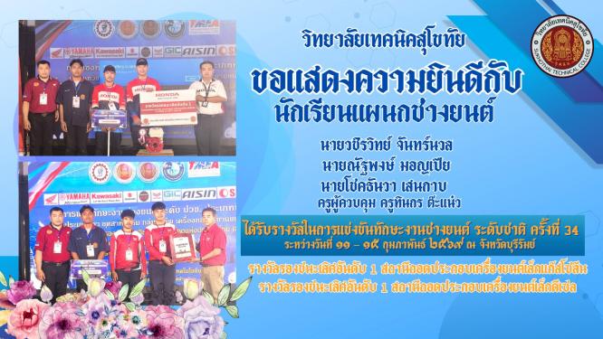 รับรางวัลรองชนะเลิศอันดับ 1 ถอดประกอบเครื่องยนต์ (ระดับชาติ) ได้รับรางวัลรองชนะเลิศอันดับ 1 (ทั้ง 2 รายการ) - ถอดประกอบเครื่องยนต์เล็กแก๊สโซลีน - ถอดประกอบเครื่องยนต์เล็กดีเซล งานประชุมวิชาการองค์การนักวิชาชีพในอนาคตแห่งประเทศไทย ระดับชาติ ครั้งที่ ๓๔ ประจำปีการศึกษา ๒๕๖๘ จัดขึ้นระหว่างวันที่ ๑๑ ? ๑๕ กุมภาพันธ์ ๒๕๖๙ ณ จังหวัดบุรีรัมย์....