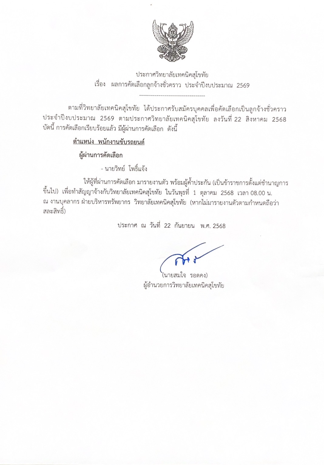 ประกาศ เรื่อง ผลการคัดเลือกลูกจ้างชั่วคราว ประจำปีงบประมาณ 2569 (พนักงานขับรถยนต์)