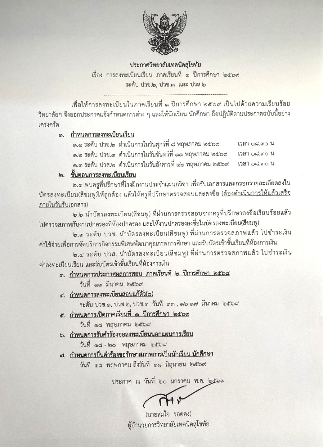ประกาศ เรื่อง การลงทะเบียนเรียน ภาคเรียนที่ 1 ปีการศึกษา 2569 (ปวช.2 ปวช.3 และ ปวส.2)