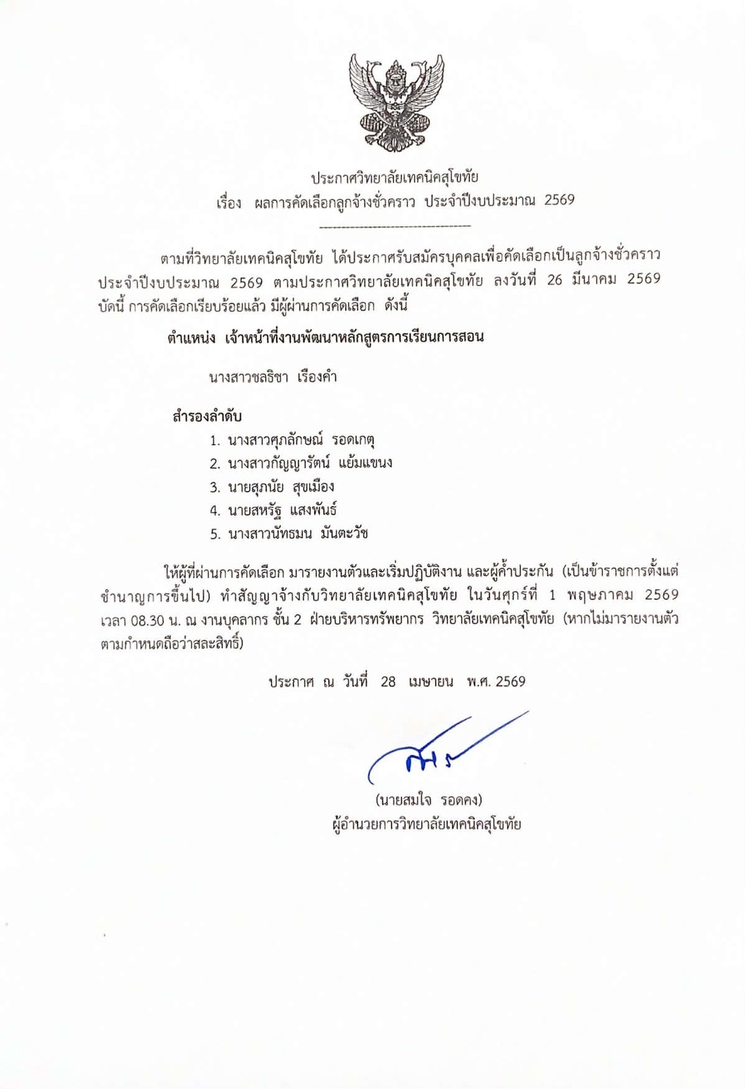 ประกาศ เรื่อง ผลการสอบคัดเลือกเป็นลูกจ้างชั่วคราว ตำแหน่ง เจ้าหน้าที่งานพัฒนาหลักสูตรการเรียนการสอน ประจำปีงบประมาณ 2569